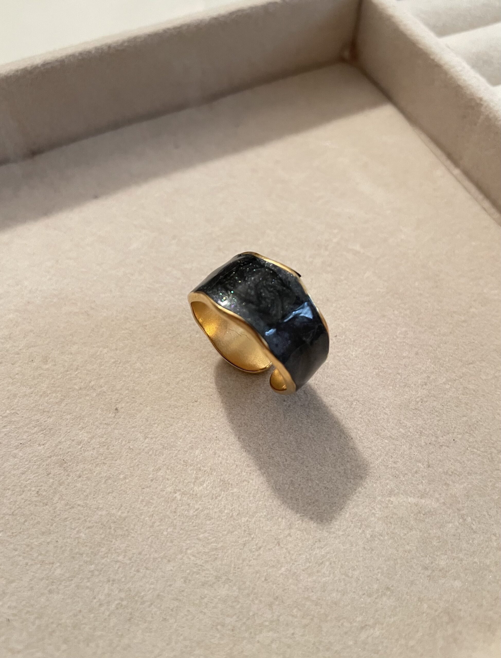 The Midnight Glow Ring is a bold statement piece, featuring a sleek black finish framed with polished edges. Its adjustable design makes it perfect for both everyday wear and special occasions.