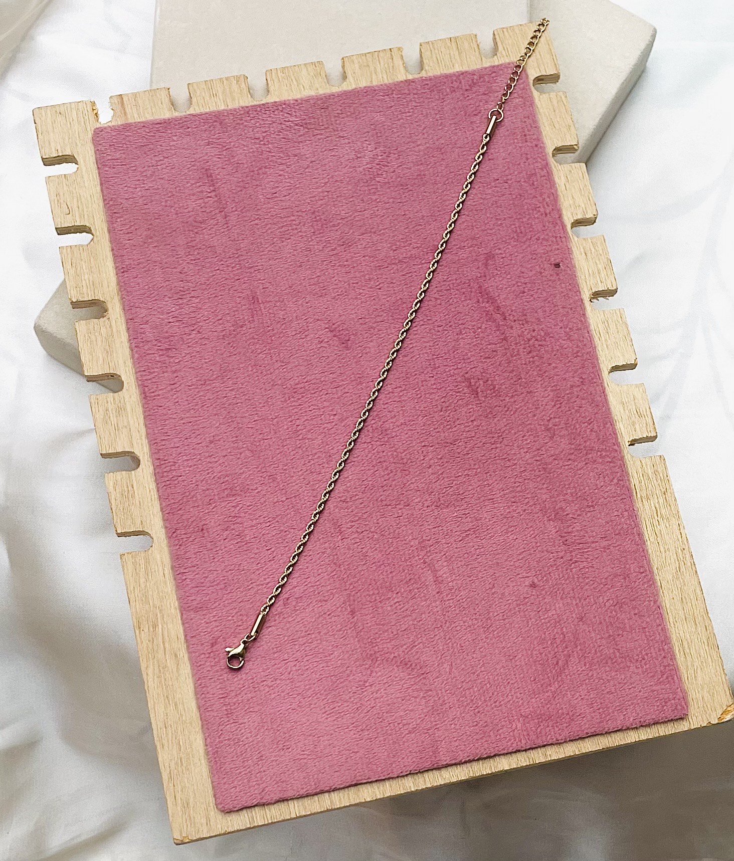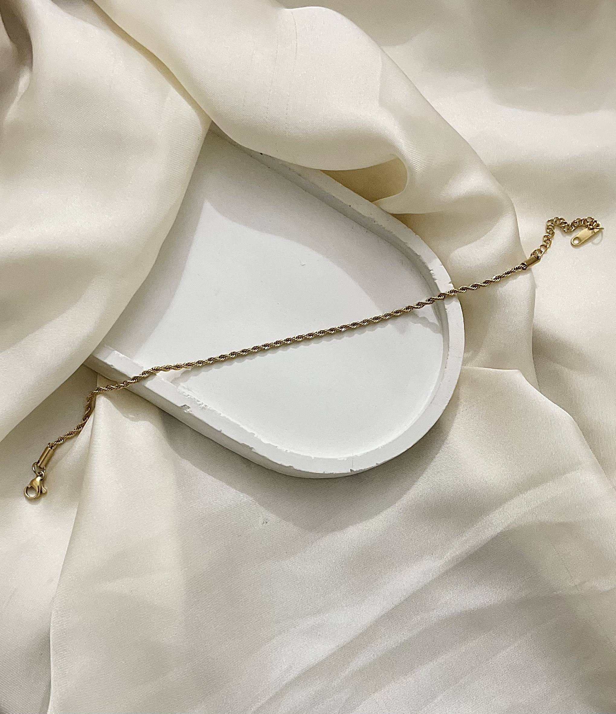 The Sleek Twist anklet showcases a refined rope-style chain in a radiant gold tone, combining elegance with subtle texture. Its timeless design makes it versatile for both everyday wear and special occasions.